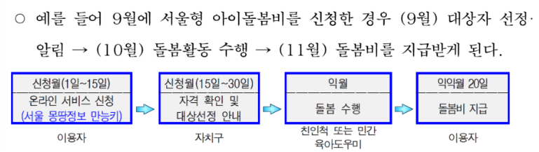 9월 신청 → 10월 돌봄 → 11월 지급 이런 방식으로 진행되며 11월 12월 내년 1월 돌봄수당이 지급됩니다.